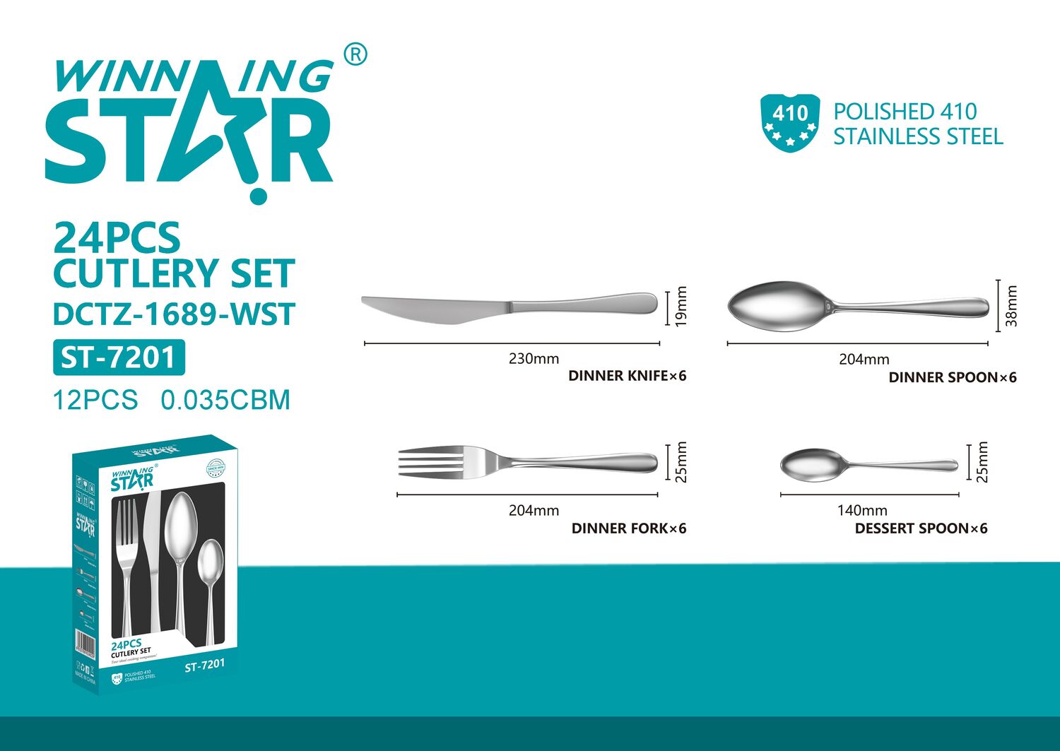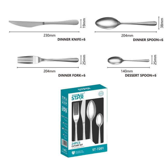 ST-7201 нь өдөр тутмын хэрэглээнд тохиромжтой, зэвэрдэггүй ган материалаар хийгдсэн 24 ширхэг хоолны хэрэгслийн иж бүрдэл юм. Энгийн, цэвэрхэн загвартай тул гэр ахуй, зоогийн газар, оффис болон зочны ширээнд ашиглахад тохиромжтой.