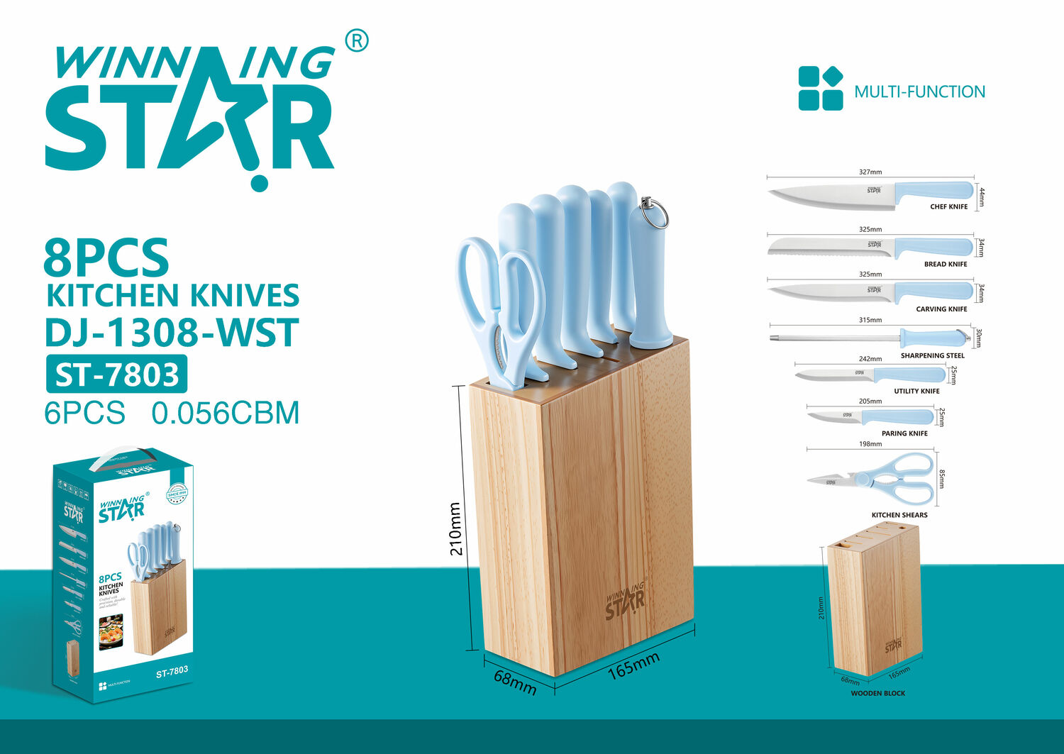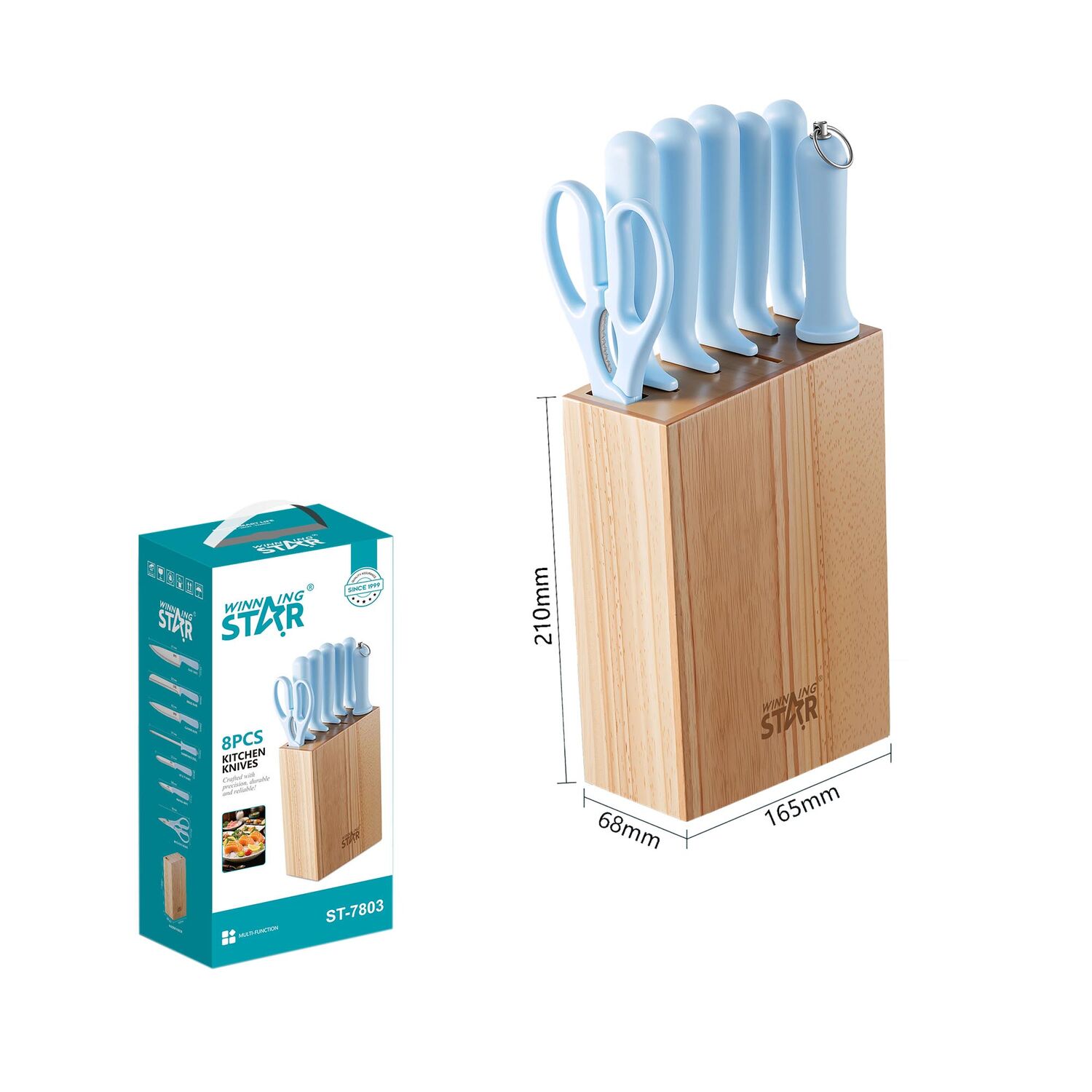 ST-7803 нь өдөр тутмын хоол бэлтгэлд хэрэгцээтэй үндсэн хутгуудыг багтаасан 8 ширхэг гал тогооны хутганы иж бүрдэл юм. Зэвэрдэггүй ган иртэй тул хурц, бат бөх бөгөөд удаан хугацаанд ашиглахад тохиромжтой.