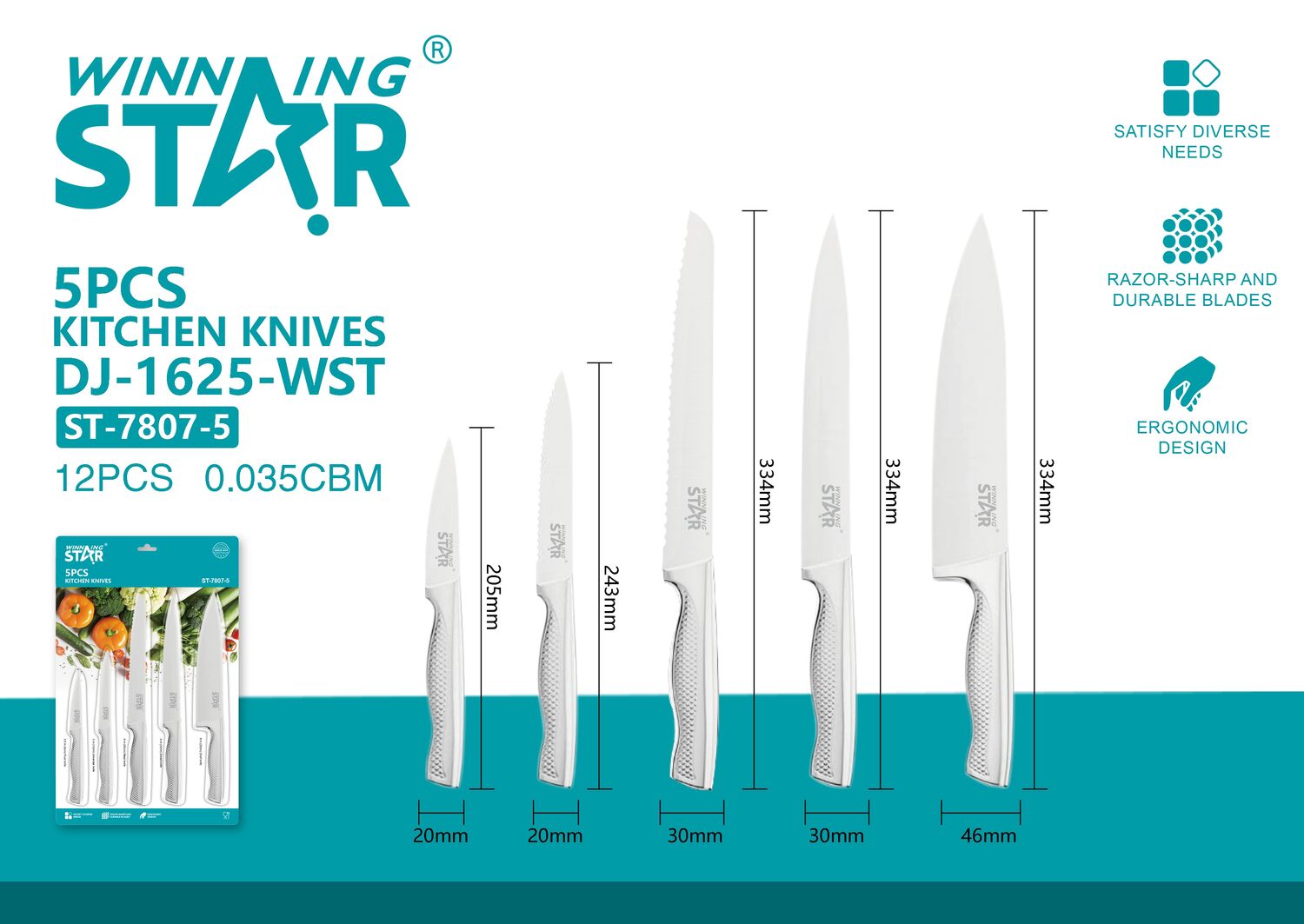 ST-7807-5 нь өдөр тутмын хоол бэлтгэлд шаардлагатай үндсэн хутгуудыг багтаасан 5 ширхэг гал тогооны хутганы иж бүрдэл юм. Зэвэрдэггүй ган иртэй тул хурц, бат бөх бөгөөд удаан хугацаанд найдвартай ашиглах боломжтой.